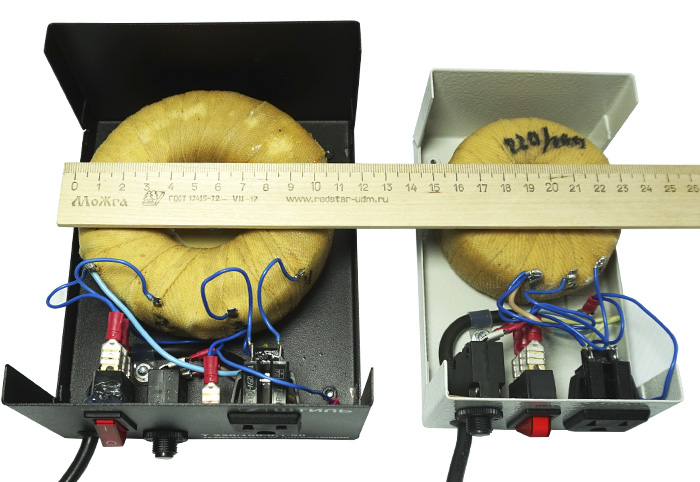 Для визуального сравнения мы сделали совместную фотографию в отрытых корпусах: трансформатора Т 20-220/100-0,1-50, он в черном корпусе (расположен слева) и автотрансформатора АТ 230-220/100-0,1-50, он в сером корпусе (расположен справа).